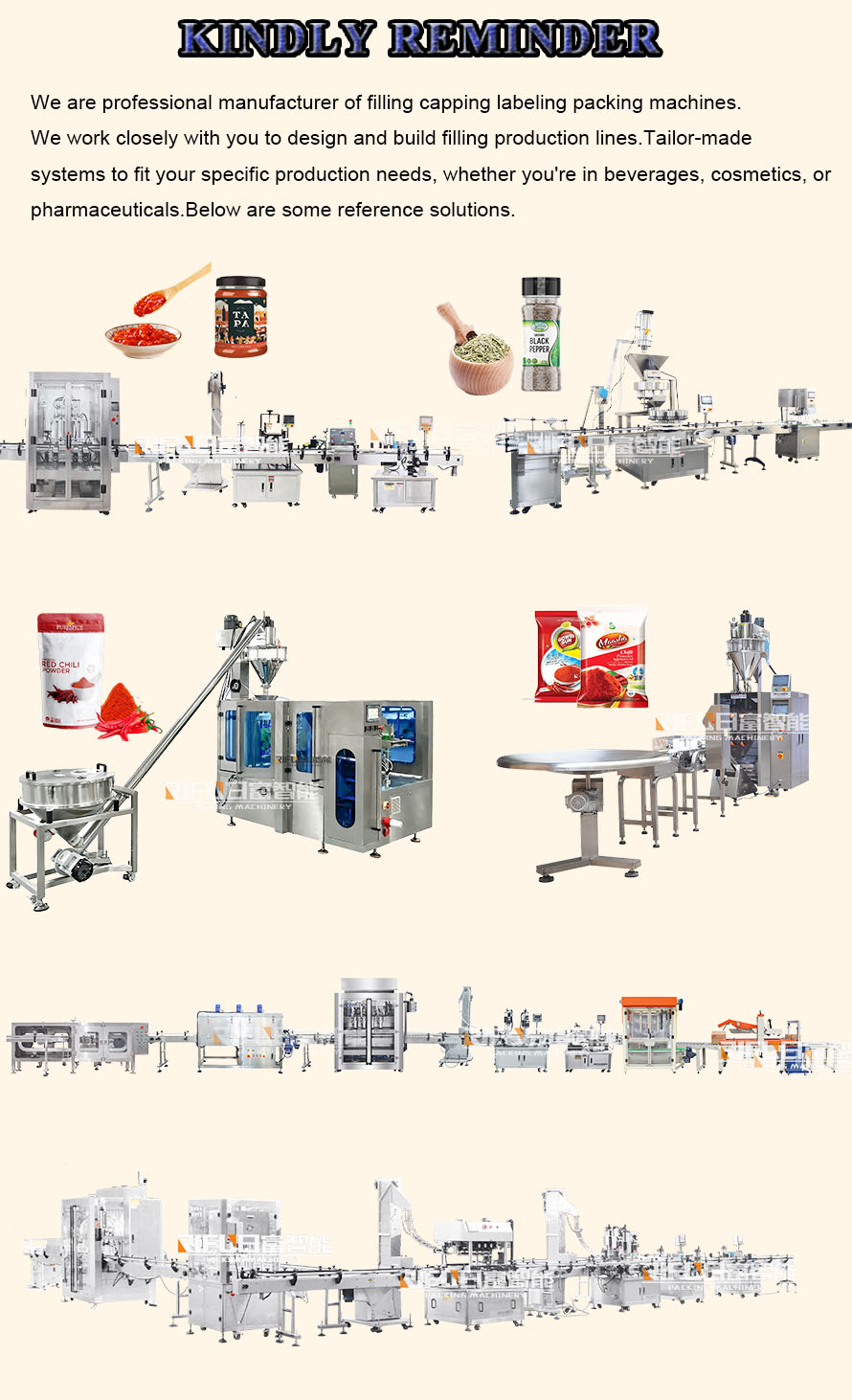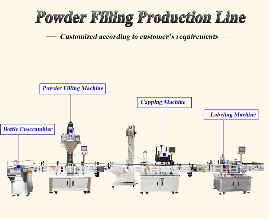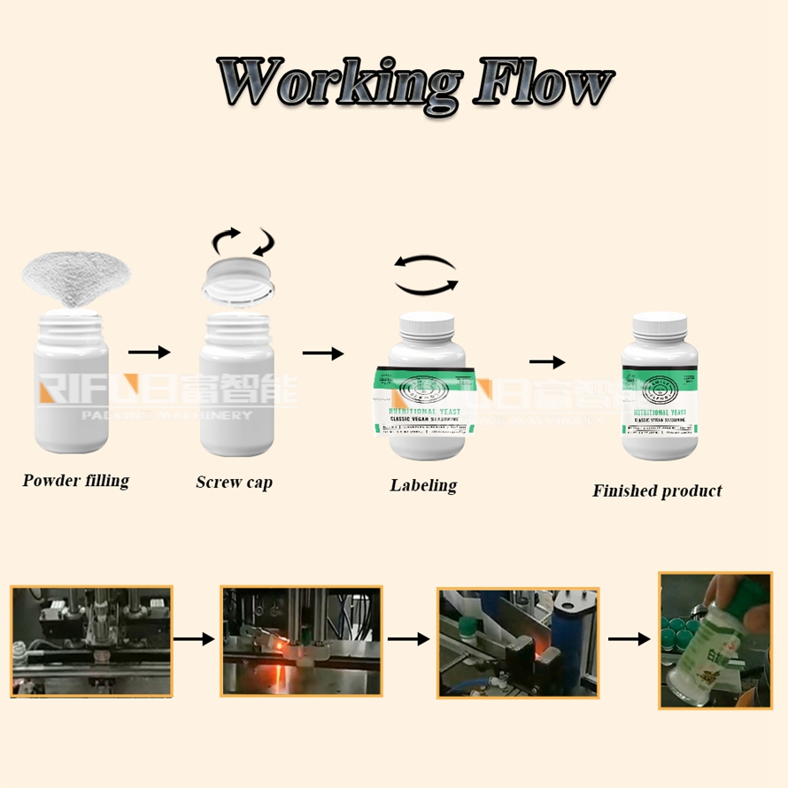 The powder filling capping labeling production line is an automated packaging solution designed for the efficient and accurate filling sealing and labeling of powdered products,such as seasoning powder,yeast powder,bleaching powder,pesticide powder,protein powder,flour,etc.This line is ideal for industries such as food,pharmaceuticals,and cosmetics that require high standards of hygiene and precision.Key Components: * Powder Filling Machine:Precisely fills containers with powder,available in single or multi-head configurations to suit production needs. * Capping Machine:Securely tightens caps onto filled containers to ensure airtight seals. * Labeling Machine:Automatically applies labels to finished products,enhancing packaging aesthetics and brand recognition.The whole line not only improves production efficiency but also ensures the quality of the products and the aesthetics of the packaging,meeting the modern requirements for efficiency,quality,and environmental care.
