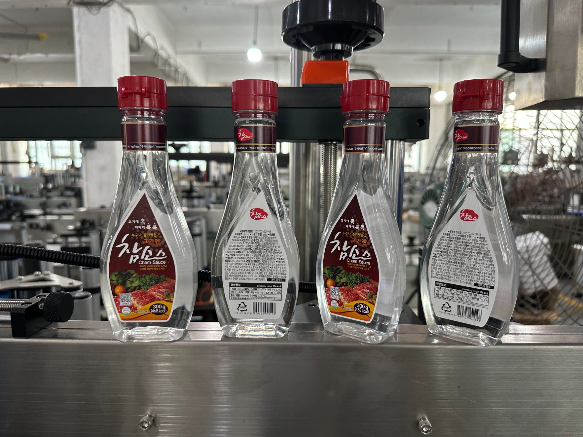 Recently, Liz, a sales specialist at Guangdong Rifu Intelligent Equipment Co., Ltd., and her team successfully delivered a Dual-Side + Neck Labeling System to a prominent Korean food company for automated labeling of transparent plastic flat sauce bottles. The test run was smooth and stable, achieving perfect labeling results with all three labels—front, back, and neck—applied accurately in a single process, earning strong customer acclaim.