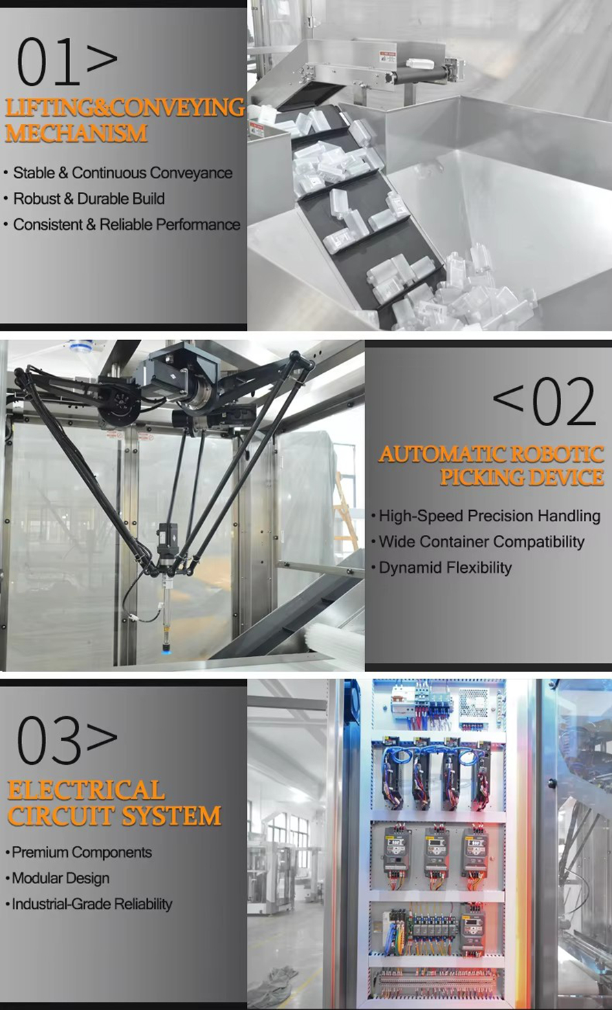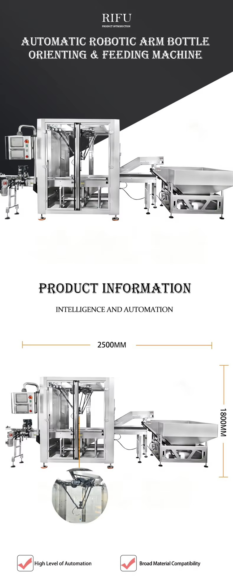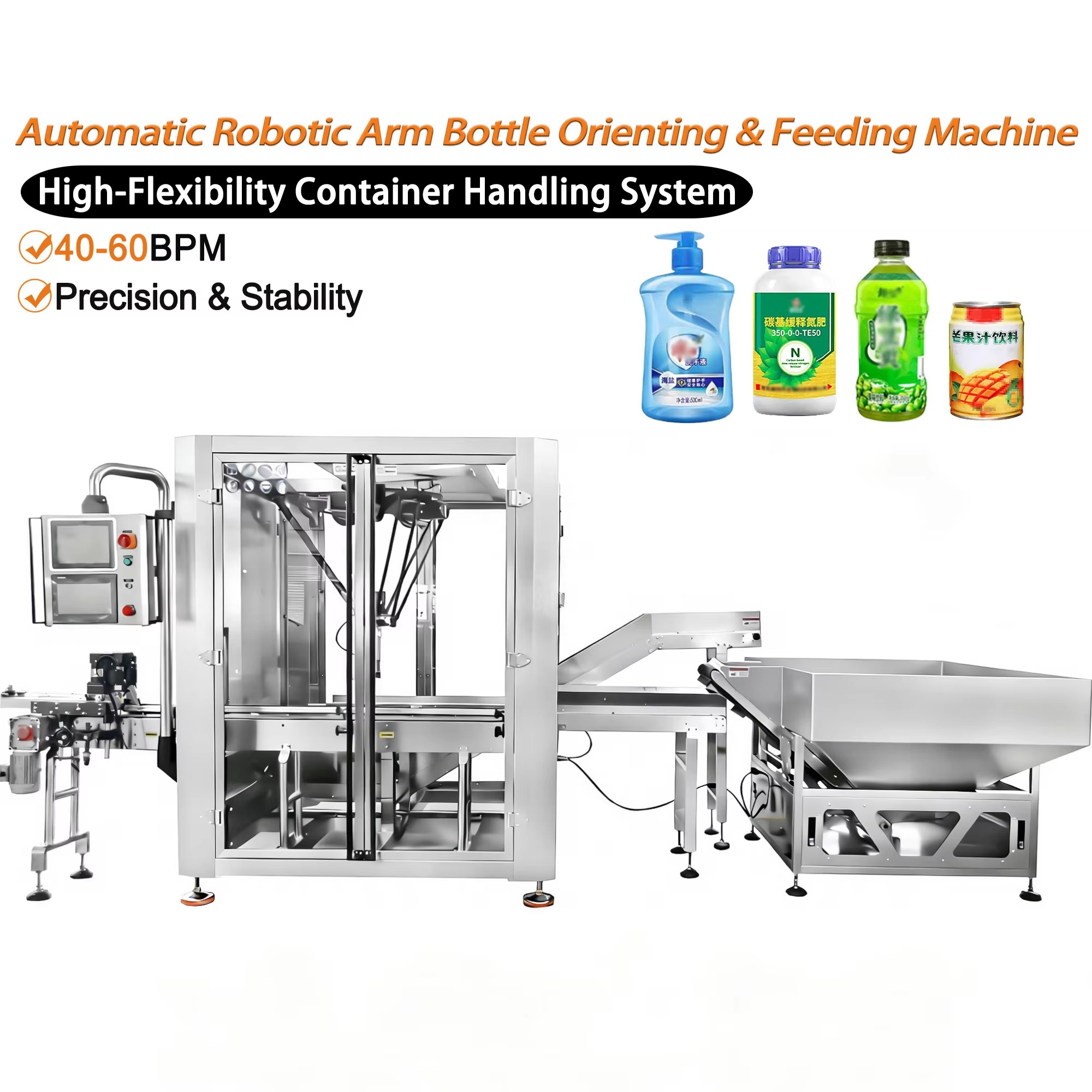 Automatic robotic arm bottle feeding and orienting machine is designed for efficient, automated container sorting, positioning and transferring in modern packaging production lines. It delivers stable, high-speed performance and seamless integration with filling, labeling and capping systems, widely used in food, beverage, cosmetic and pharmaceutical industries.