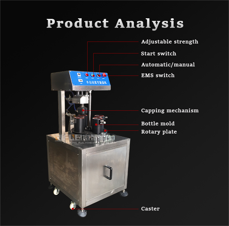 This semi auto vacuum screw capping machine, suitable for glass bottles, is widely used in food, baverage, condiment, health care product and other industries. Just put the bottles with a cap into the capping stations, and then the machine forms vacuum chamber and finishes the capping work automatically. The machine has the function of automatic capping, no bottle no capping, automatic error alarm, stable and reliable performance, etc.